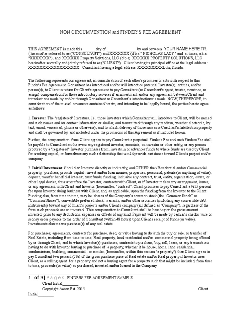 Finder S Fee Agreement Template Get Free Sample : The Above Mentioned Finder's Fee Will Be Due In Full By The Company When The Purchase Agreement Between The Company Or Company's Designated Party And The Owner Of The Property Is Executed.