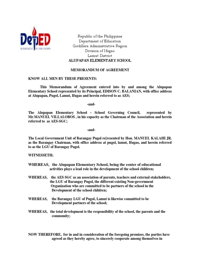 Memorandum Of Agreement Local Government Secondary School. A memorandum of agreement, or moa, is a written document that describes and defines the cooperative relationship between two parties who want to work together to achieve common goals. 6 memorandum of understanding samples. party 1, a party 1 state of incorp company, with an office located at party 1 address; Memorandum of agreement sample online for free. Provide a support mechanism to the barangay for the continued viability of the project pursuant to its goals and objectives ; This memorandum of agreement template is created by experts to guide in the formation of a consortium. It can be downloaded here in a customizable word file format and edited as desired. 7 the legal ramifications of a mou. This memorandum of agreement (this moa or this memorandum of agreement) is made and entered into on this day day of month year (effective date) by and between: Memorandum of agreement sample for event proposal. This memorandum of agreement (moa) template is available for free download. Every progressive person is searching for a solution that will eliminate papers and speed up the document workflow. Any memorandum of understanding sample would contain a mutual agreement between parties. They're considered as binding by the parties even though they don't have legal claims. Download free samples of memorandums of agreement covering all the relevant issues for the same that are available in popular formats like word and excel to avoid the hassle of drawing one up from scratch.you may also see partnership agreement templates.