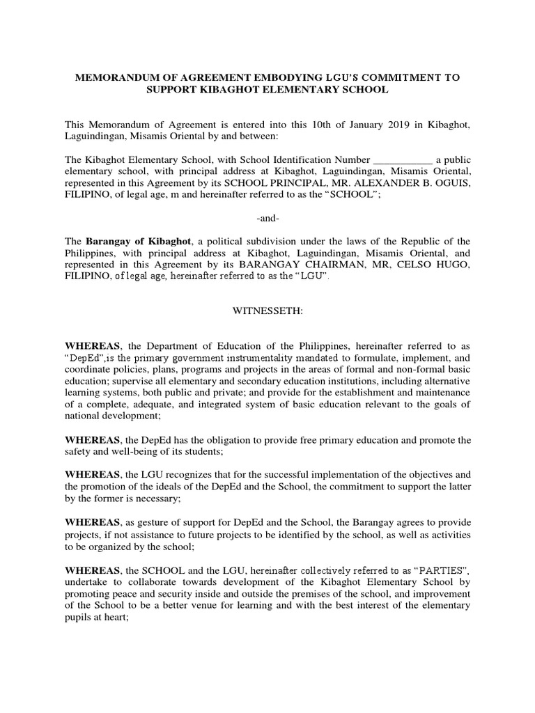 Moa Brgy Kibaghot Sample Primary Education Social Institutions. Memorandum of agreement sample for event proposal. 7 the legal ramifications of a mou. It can be downloaded here in a customizable word file format and edited as desired. party 1, a party 1 state of incorp company, with an office located at party 1 address; Download free samples of memorandums of agreement covering all the relevant issues for the same that are available in popular formats like word and excel to avoid the hassle of drawing one up from scratch.you may also see partnership agreement templates. They're considered as binding by the parties even though they don't have legal claims. Memorandum of agreement sample online for free. This memorandum of agreement (this moa or this memorandum of agreement) is made and entered into on this day day of month year (effective date) by and between: Every progressive person is searching for a solution that will eliminate papers and speed up the document workflow. This memorandum of agreement (moa) template is available for free download. This memorandum of agreement template is created by experts to guide in the formation of a consortium. 6 memorandum of understanding samples. A memorandum of agreement, or moa, is a written document that describes and defines the cooperative relationship between two parties who want to work together to achieve common goals. Any memorandum of understanding sample would contain a mutual agreement between parties. Provide a support mechanism to the barangay for the continued viability of the project pursuant to its goals and objectives ;
