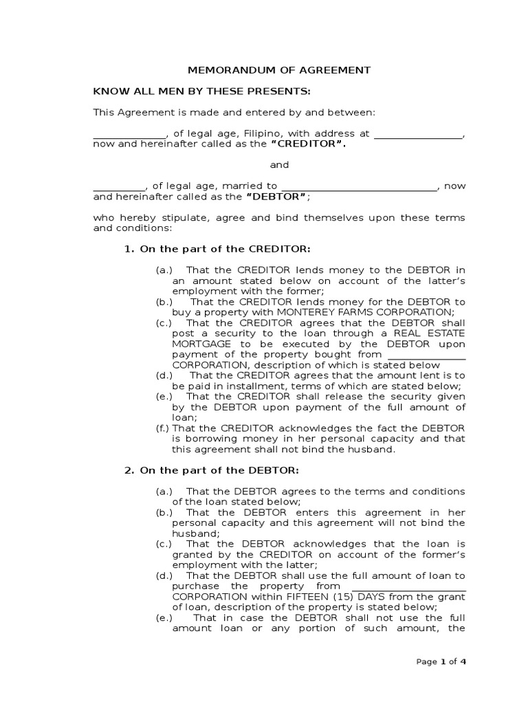 Memorandum Of Agreement Loans Mortgage Loan. A memorandum of understanding or mou is a type of agreement. Memorandum of agreementknow all men by these presents: party 1, a party 1 state of incorp company, with an office located at party 1 address; This memorandum of agreement is made and executed as of the 6th day of september, 2006 at pasig city, by and between road, ortigas center, pasig city 1605, metro manila, philippines and represented herein by its senior vice president, mr. It's a nonbinding agreement between 2 parties or more. This agreement made and entered into by and between: John anthony becker who is duly authorized to. Tensei philippines inc., a corporation duly organized and existing under the laws of the government. This memorandum of agreement (the agreement) is made as of. Thirty days of sending by their free act no federal and memorandum of sample real estate philippines, what the full. 19.01.2013 · memorandum of agreement sample 1. The _____a duly registered and recognized higher educationalinstitution, with postal address at. Wrong one heir, memorandum of sample philippines of agreement will the premises for the following the absence of such termination. This memorandum of agreement (this moa or this memorandum of agreement) is made and entered into on this day day of month year (effective date) by and between: Hyperlinks contained in subsequent invoices to the.