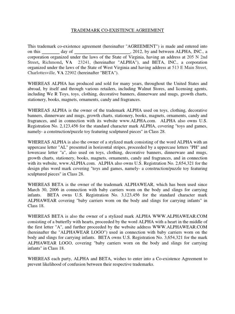 How Effective Are Trademark Coexistence Agreements In China Managing Intellectual Property. In a formal trademark coexistence agreement both parties recognize the right of the other to their respective mark and agree the terms on which they may exist together in the market place. For example, the two owners might agree that their respective goods or services will be offered in different geographic areas. Although competitors frequently use coexistence agreements to avoid or settle lawsuits, there is no significant scholarship discussing the legal validity of such. Savesave sample coexistence agreement for later. A trade mark coexistence agreement is an agreement made by two parties to use a similar trademark for marketing purposes without interfering in each other's enterprises. They are usually drafted to either settle a conflict or stop one from arising. Most coexistence agreements involve business names and trade marks, so that people who have the same or similar names, or whose businesses do, can go about their daily activities without worrying that they will be sued for passing off or trade mark infringement. Coexistence agreements are contracts that attempt to resolve these types of potential trademark disputes. A trademark coexistence agreement is a legal contract that binds the signatories to certain terms and conditions. Coexistence agreements allow potentially confusing trademarks to coexist in the market without trademark infringement lawsuits. 100%(9)100% found this document useful (9 votes). Such coexistence may be based on a division of the territories in which each holder may operate, or on a. In trademark law, coexistence agreements are contracts whereby two trademark owners agree to use their similar marks, but agree to limitations. Agreements of this nature are often made as parties only require regional use of their trademarks. Notwithstanding anything to the contrary in this section 5.2 or any ancillary agreement or other agreement between the parties, the parties shall make no use of any corporate n.